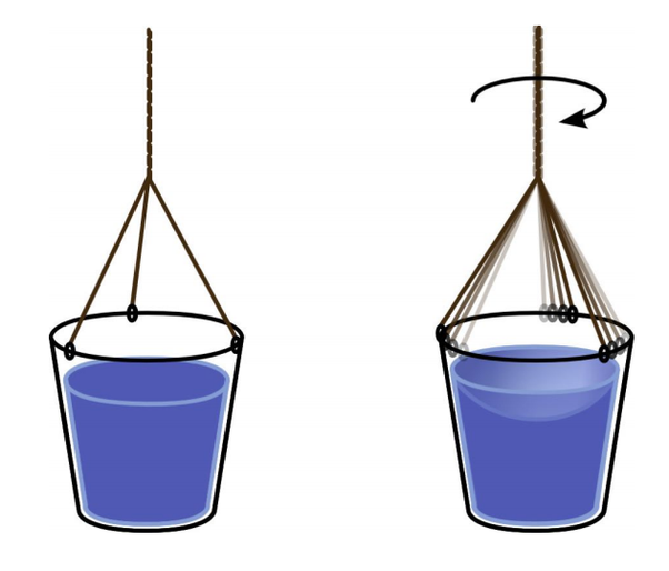 ◦ O porquê não é o balde: Antes de girar o balde, não havia nenhum movimento relativo entre o balde e a água, e, depois de girá-lo, transcorrido um certo tempo, a água girará com a mesma velocidade angular que o balde (devido a força de atrito das paredes do balde sobre a água), e os dois passarão a não ter, novamente, nenhum movimento relativo entre si.