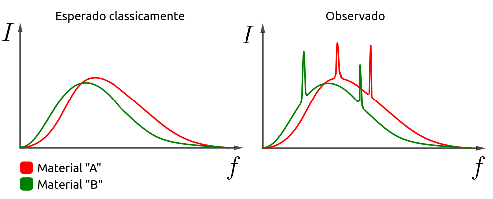 O espectro identificado na natureza se assemelha ao espectro previsto classicamente. O que o difere das predições clássicas é a presença de picos de intensidade para determinadas frequências de ondas. |