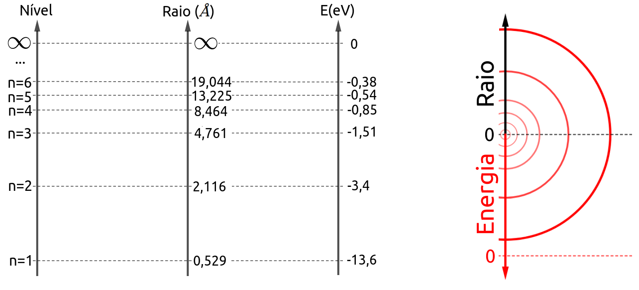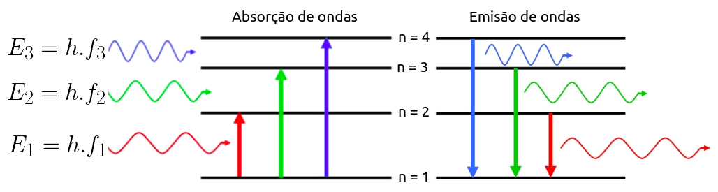 Conforme o que apontou Bohr, um elétron pode absorver ou emitir apenas fótons cujas energias correspondem a diferenças de níveis energéticos. Portanto, um fóton absorvido ou emitido terá que ter energia igual a: