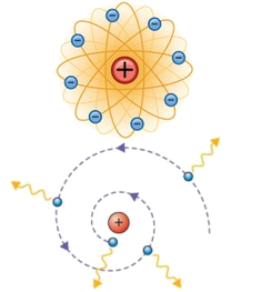 O modelo de rutherford propunha que os átomos fossem constituidos por cargas elétricas negativas que moviam-se circularmente ao redor de um núcleo maciço de carga elétrica positiva. Este modelo ficou conhecido como modelo plenetáio de Rutherford. No entanto, há muito já se sabia que cargas aceleradas geram campos magnéticos. Portanto, como neste modelo o elétron executa um movimento circular, ele havia de ter aceleração centrípeta e tal aceleração deveria promover uma perda energética — Uma mitigação de sua eneriga potêncial elétrica — que faria o elétron necessariamente cair em espiral em direção ao núcleo. E tudo isto deveria acontecer, de acordo com os cálculos, dentro de 10-11 segundos. Além disto, a queda espiralada do elétron em direção ao núcleo deveria promover emissões de ondas que fossem contínuas e a cada instante mais energéticas. Tais ocorrências não são verificadas na natureza. |