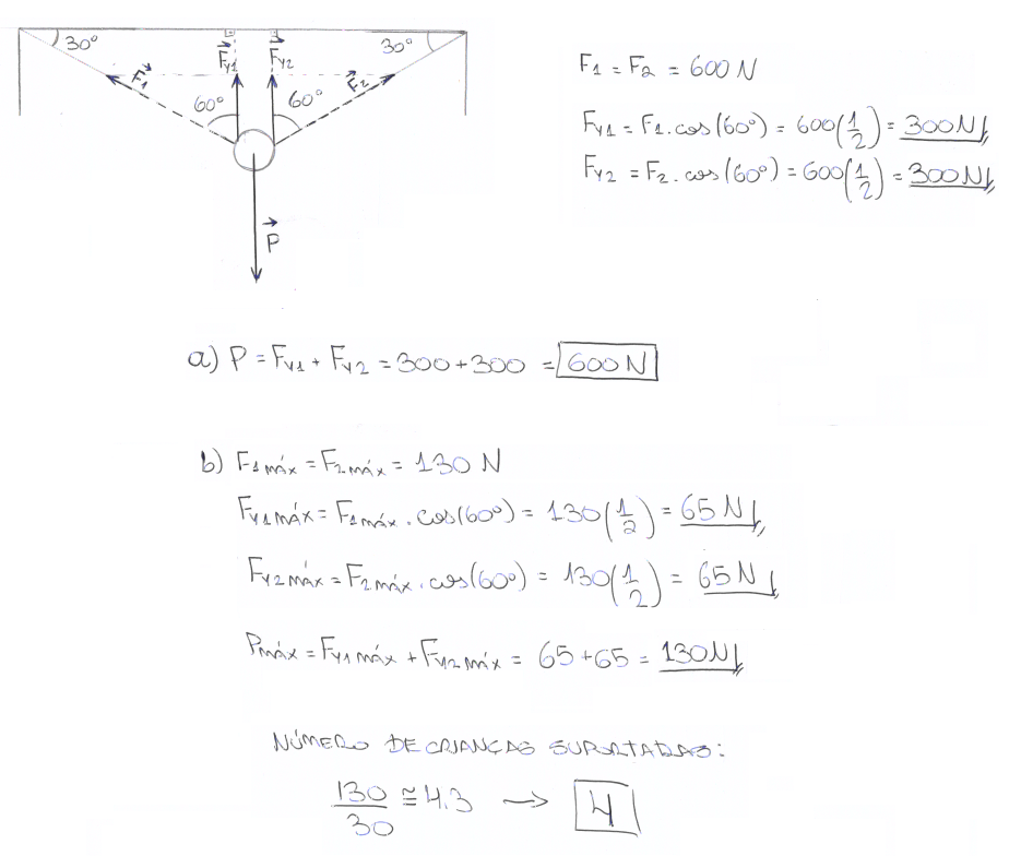 b) O gancho da parede foi mal instalado e resiste apenas até 130 N. Quantas crianças de 30 kg a rede suporta? (suponha que o ângulo não mude).