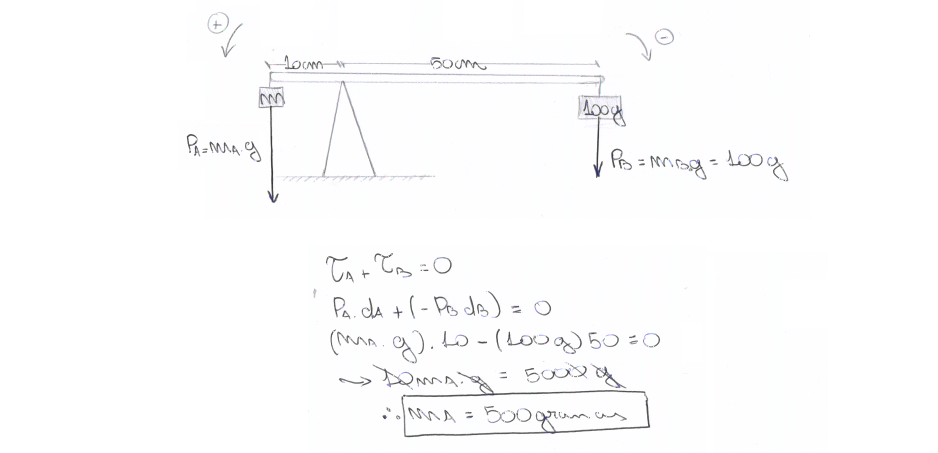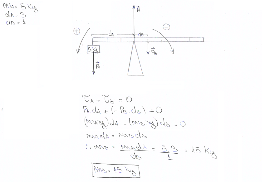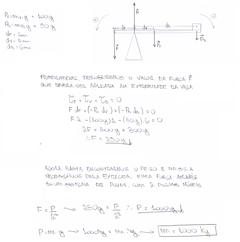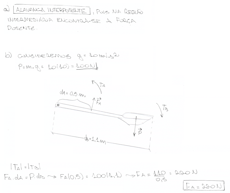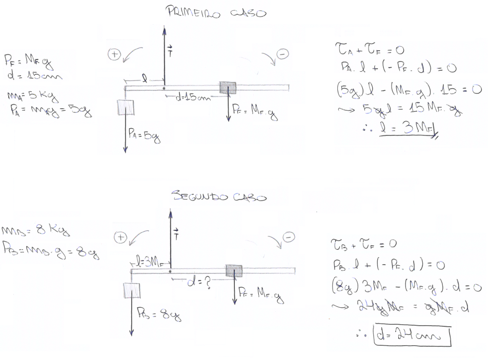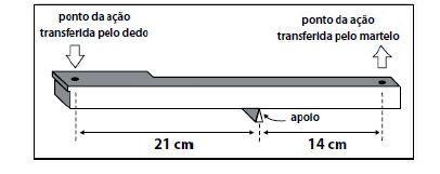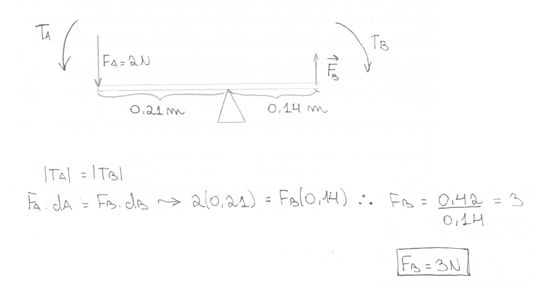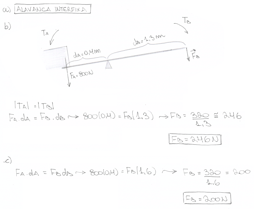 b) Suponha que a pessoa tenha usado um apoio a 40 cm dos pés do piano suspenso. Qual o valor da força aplicada do outro lado da alavanca, a 1,30 m de distância de apoio?