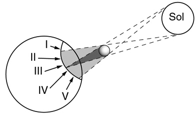 IV. O eclipse solar demostra a face da Terra sobre a Lua.