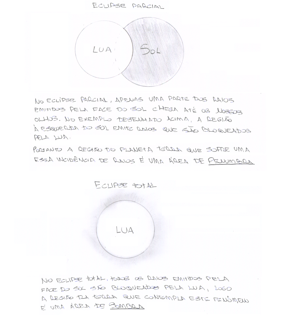 MARIA: O eclipse solar ocorre quando a lua posiciona-se entre o sol e a terra, fazendo o sol “desaparecer”. E o eclipse lunar ocorre quando a lua está na região de sombra da terra.