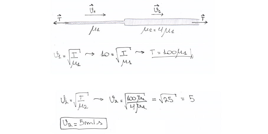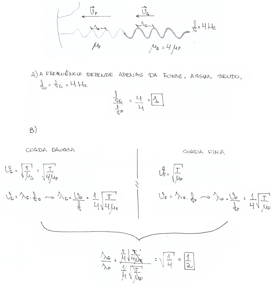b) determine a razão entre os comprimentos de onda das ondas nas duas cordas.