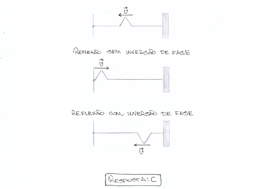 b) Ao ser refletido e voltar para extremidade fixa, o pulso voltará com a fase invertida.